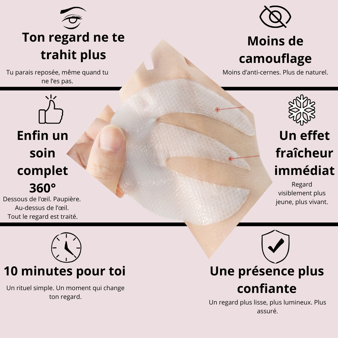 Les patchs classiques traitent uniquement le dessous de l'œil. C'est pour ça que malgré des années d'utilisation, la paupière reste marquée et le dessus de l'œil ignoré. Harmonéa Regard 360 est le premier masque conçu pour envelopper les 3 zones complètes — dessous, paupière et dessus. Vous ne traitez plus une partie du problème. Vous traitez le regard entier.